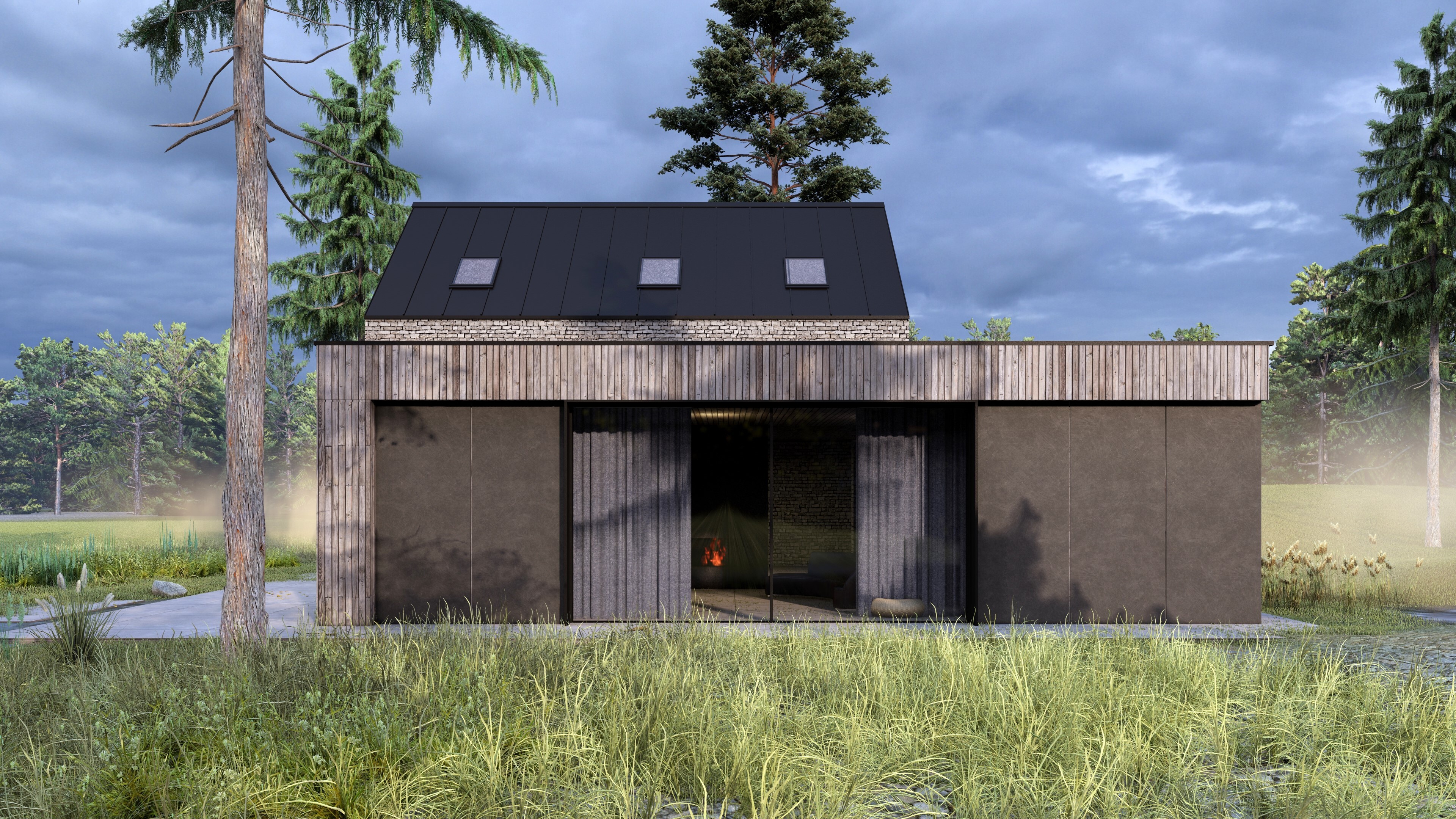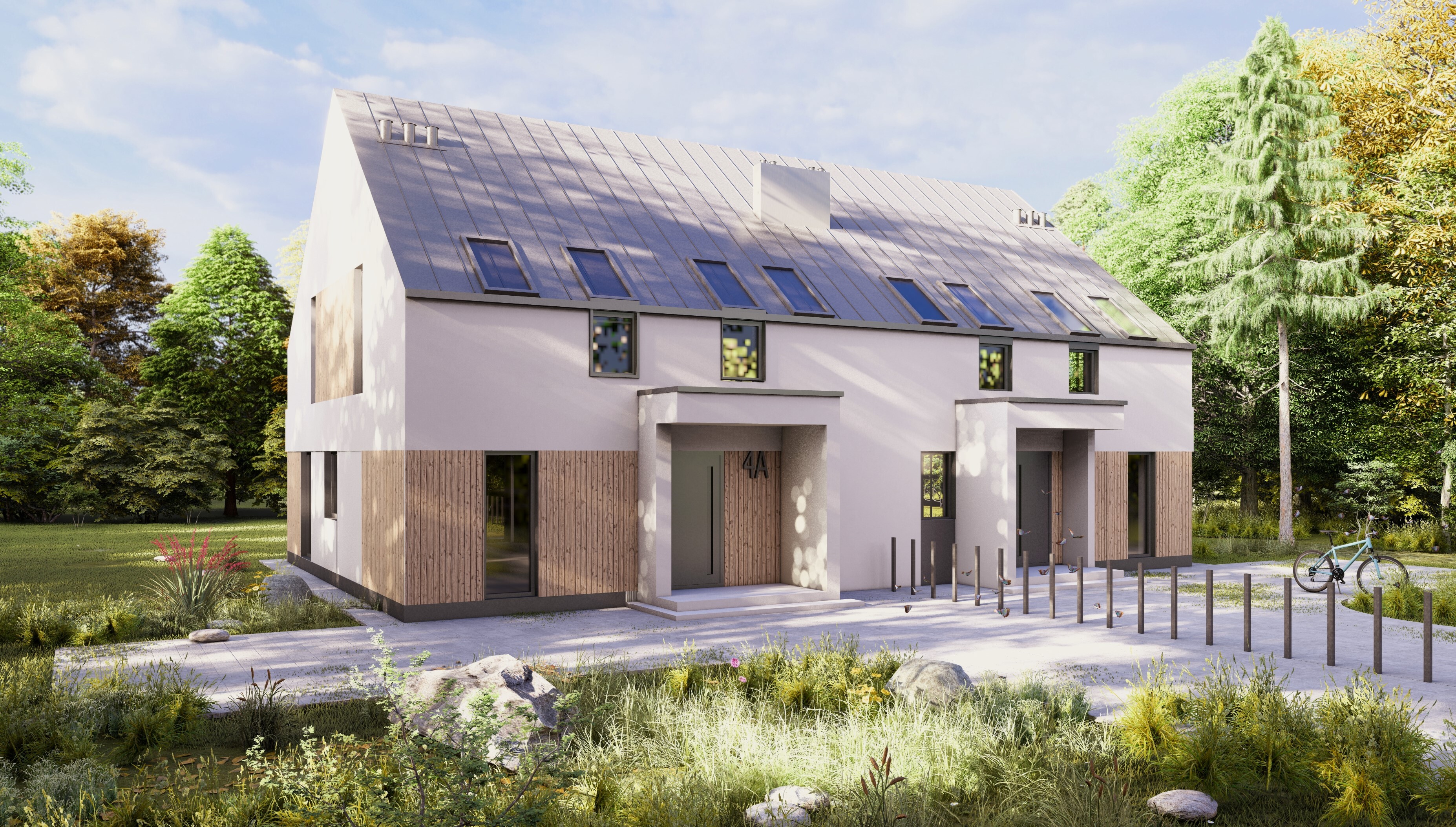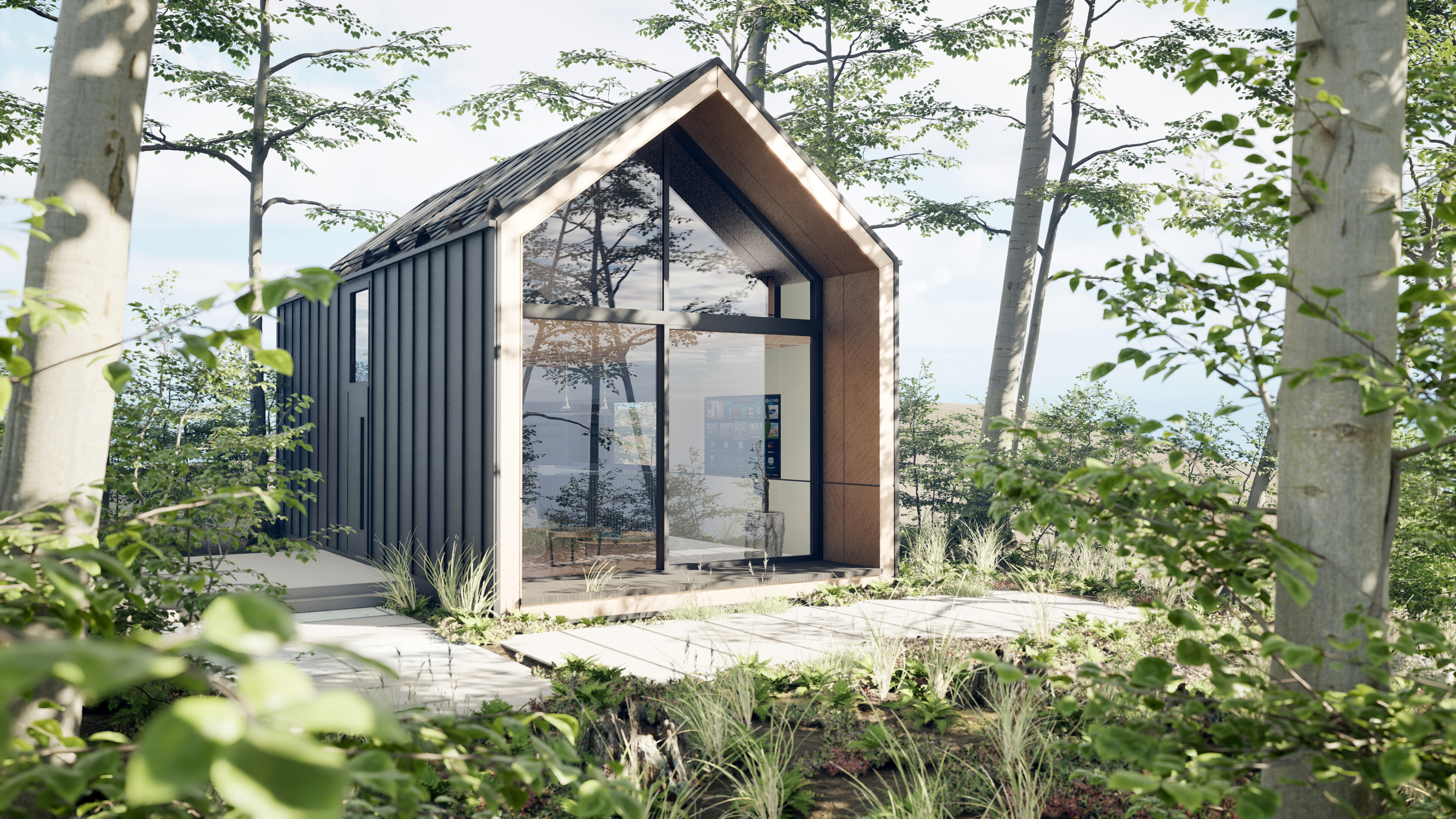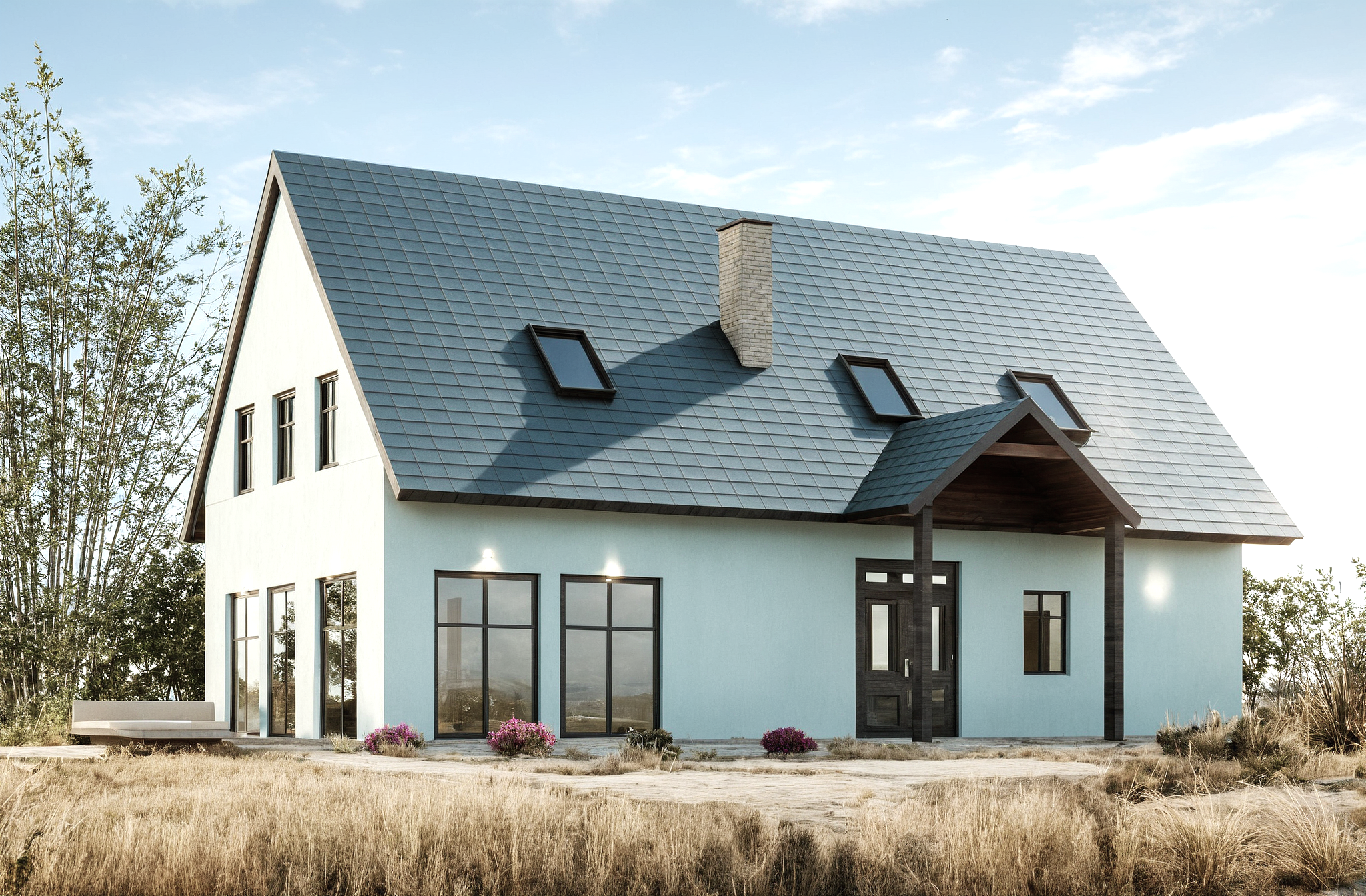 Blue building with orange window frames.